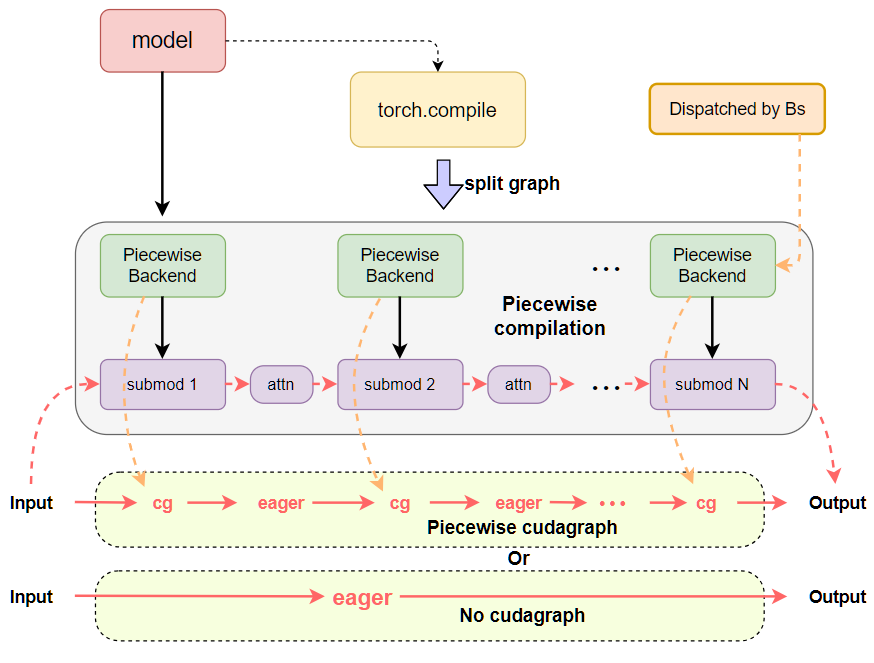 • PIECEWISE — a single-mode strategy (and past default). It is the most flexible: attention or other CUDA Graphs-incompatible operations stay eager, everything else goes into CUDA Graphs. Requires piecewise compilation.